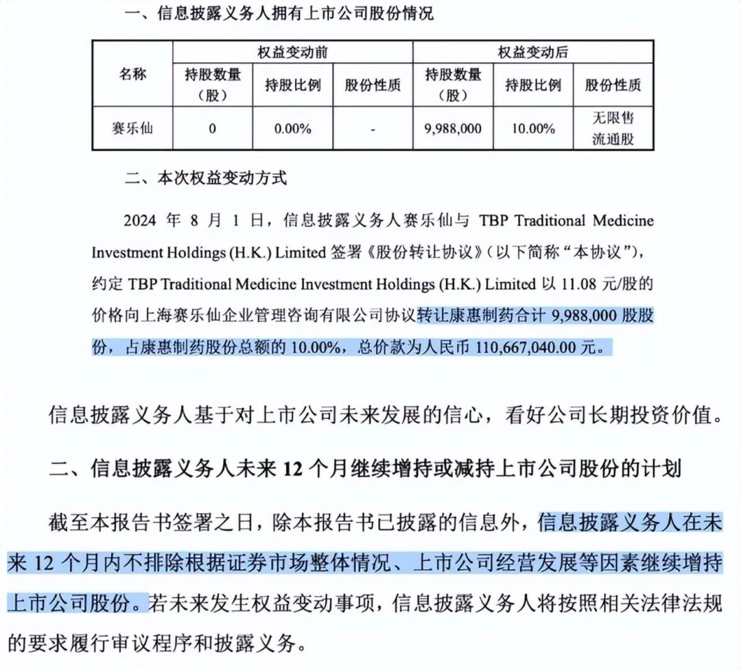 2024年8月1日,康惠制药原二股东“TBP”公司(挚信资本旗下离岸公司)实施了一项股权转让:向上海赛乐仙企业管理咨询有限公司(简称“赛乐仙”)转让无限售条件流通股9,988,000股(占公司总股本的10%)。
