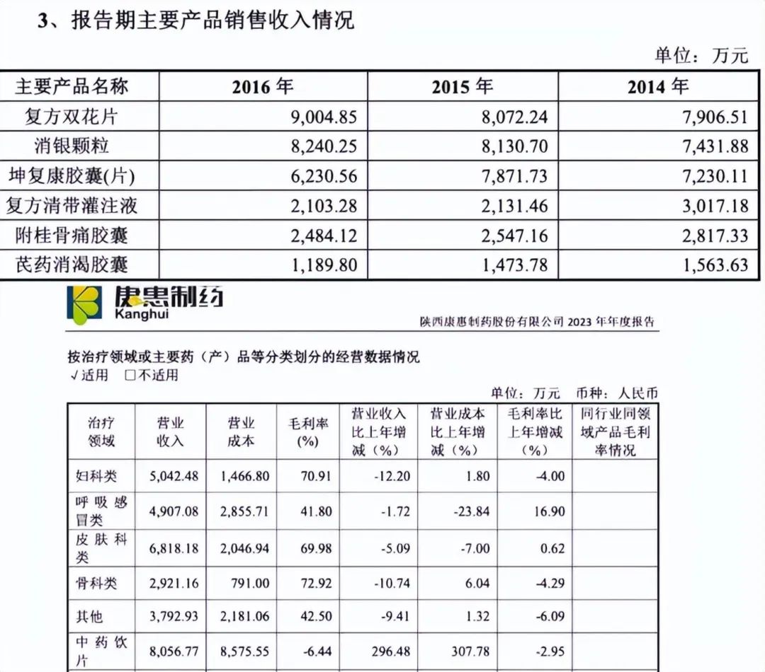 这个过程中,公司自产中成药销售呈现急剧衰落:上市前的2016年,康惠制药呼吸感冒类成药年销售额超过9千万元,一度雄心勃勃将主打“复方双花片”对标设为连花清瘟与蒲地蓝口服液。