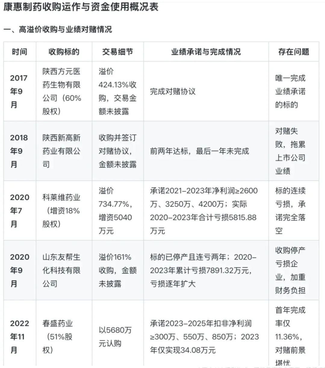 比如,其频繁以高溢价收购业绩不佳企业的直接结果是:仅1家完成对赌,其余标的均亏损或未达承诺,显著拖累公司业绩。同时引发的疑问是:收购标的集中在停产、亏损或小微药企,疑似“扶贫式”运作,商业逻辑存疑。