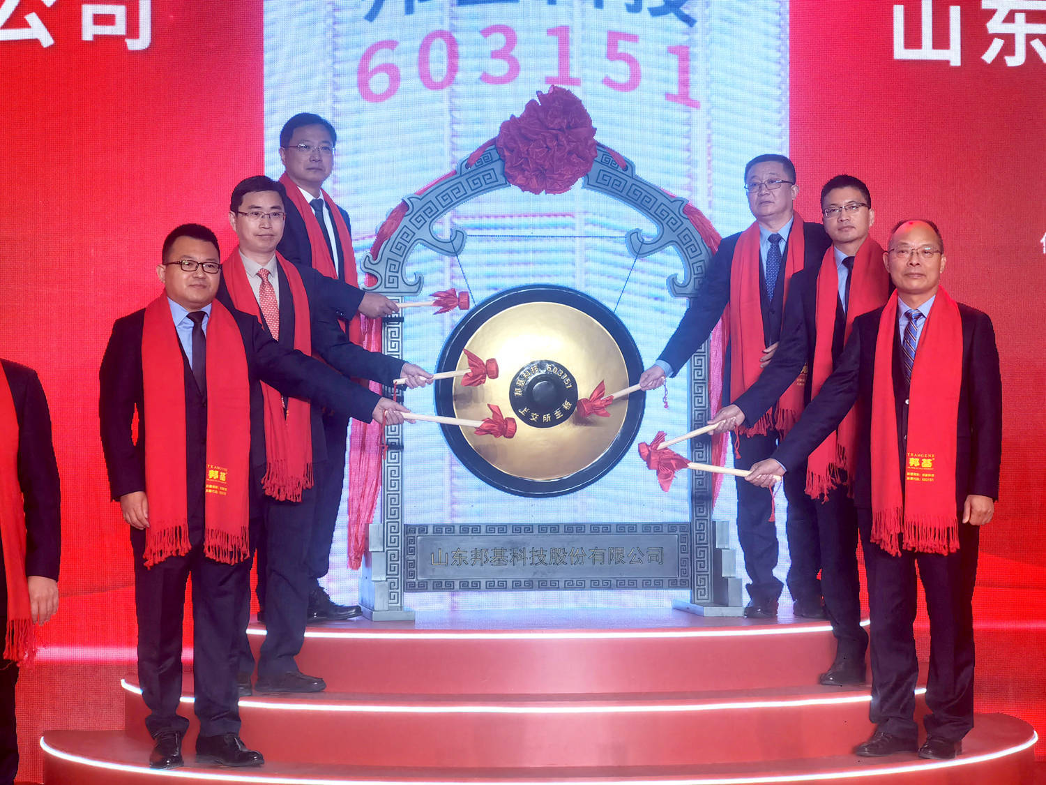 仪式上,淄博市委书记马晓磊,山东邦基科技股份有限公司董事长、总经理王由成等6人作为敲锣嘉宾,邦基科技高管团队的王由利等12人作为见证嘉宾,共同为邦基科技主板股票交易鸣锣开市。本次发行的A股股票将在上海证券交易所上市,发行后公司总股本为1.68亿股,其中,本次发行的4200万股社会公众股将于今日起上市交易。