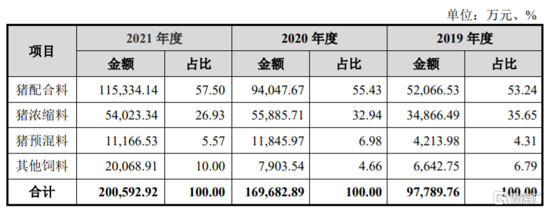 具体来看,邦基科技的主要产品包括猪配合料、猪浓缩料、猪预混料,三者合计的主营业务收入占比约90%,其他饲料主要为蛋禽预混料、肉类反刍饲料等。