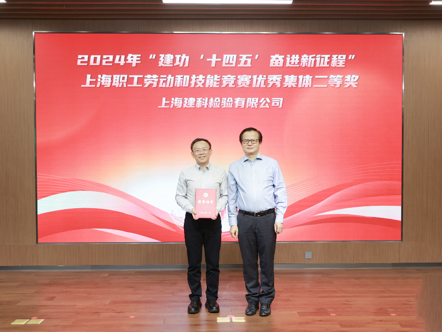 集团财务总监沈新根为荣获2024年“建功‘十四五’奋进新征程”上海职工劳动和技能竞赛优秀集体二等奖的检验公司颁奖。