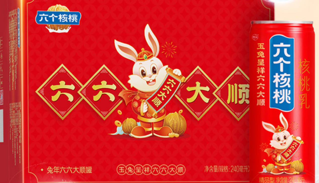 今年,六个核桃兔年贺岁罐围绕“玉兔呈祥六六大顺”为主题,结合象征美好的生肖兔来传达新年心意,迎合了中国人在新年这一特殊节点对美好生活的向往和寄托,从心理上给足消费者“归属感”。正是凭借“顺”文化的品牌积淀,六个核桃与“六六大顺”的吉祥寓意强势绑定,同时还有健康美味和营养健脑等硬实力打基础,六个核桃正在成为年货市场的新宠,也是不少人过年走亲访友,团圆欢聚的标配饮品。