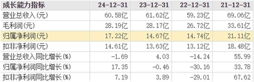 从公司前不久发布的财报来看,2024年养元饮品营业收入60.58亿元,同比下滑1.69%,净利润17.22亿元,同比增长17.35%;到了2025年第一季度,营收18.6亿元,同比下滑19.7%,净利润6.42亿元,同比下滑26.95%。表面上看,2024年净利润实现逆势增长是唯一亮点,但深入分析不难发现,这一增长与“六个核桃”本身关联并不大。