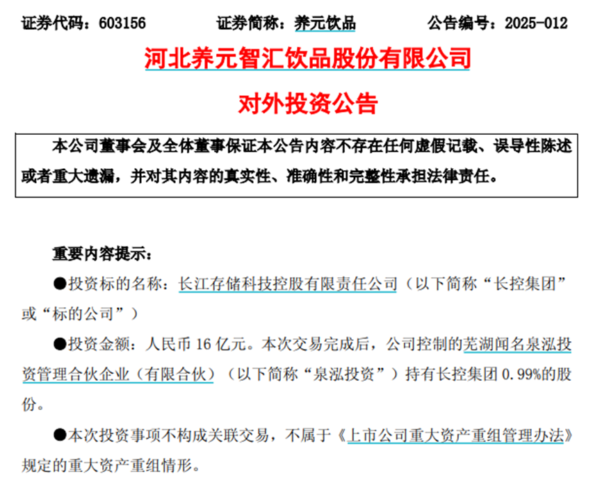 今年4月底,养元饮品发布公告,旗下投资机构泉泓投资将以现金出资16亿元投资长江存储,交易完成后将获后者0.99%股权。在半导体行业高度内卷的当下,几乎花光2024年全部净利润的养元饮品,能在新领域成功翻身吗?