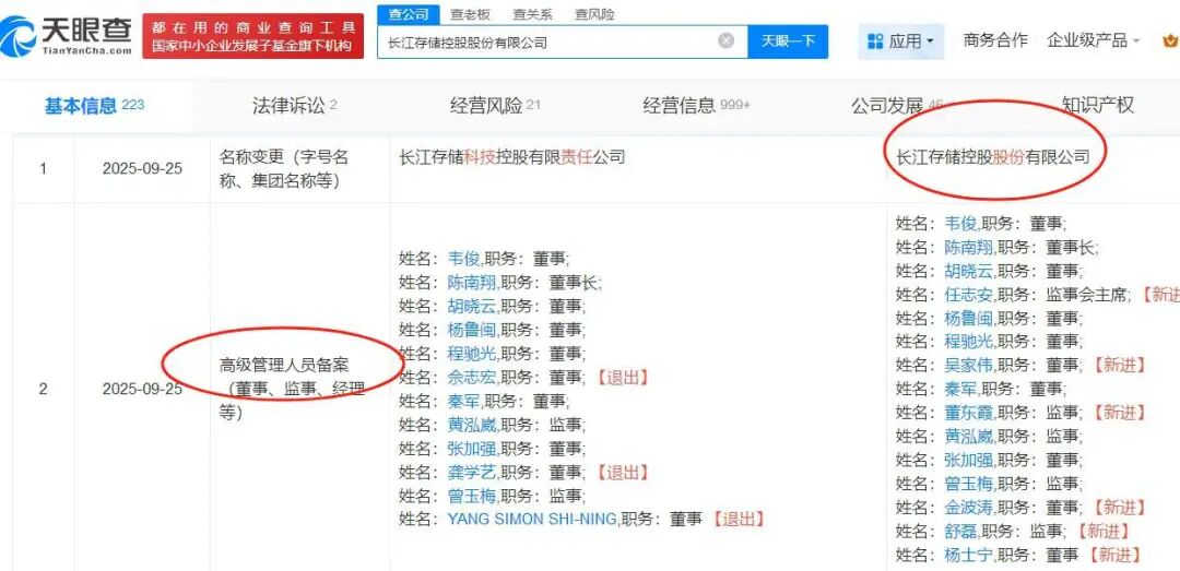 深蓝财经查询天眼查信息显示,9月25日,长江存储科技控股有限责任公司正式变更为长江存储控股股份有限公司(简称“长存集团”),同时选举产生了新一届董事会成员。