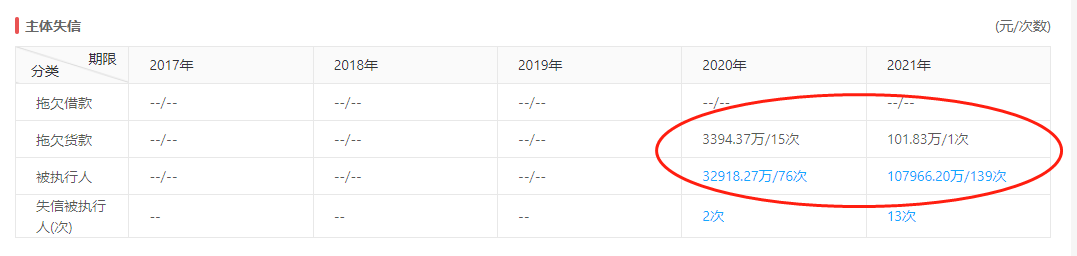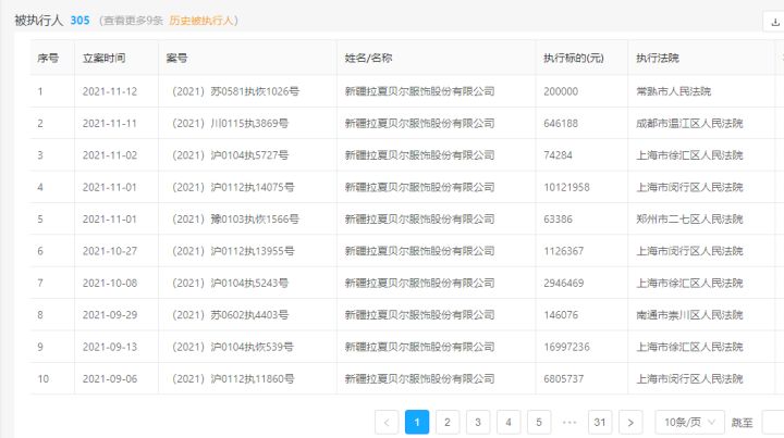 拉夏贝尔主体投资的企业和子公司在最近三年里共失信391次,累计金额达¥26.8837亿。