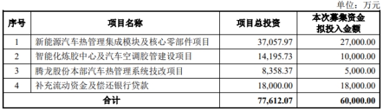 12月17日,腾龙股份披露的公开发行可转换公司债券预案显示,公司本次发行的可转债募集资金总额不超过60,000.00万元(含),扣除发行费用后,募集资金将用于以下项目:“新能源汽车热管理集成模块及核心零部件项目”、“智能化炼胶中心及汽车空调胶管建设项目”、“腾龙股份本部汽车热管理系统技改项目”、“补充流动资金及偿还银行贷款”。