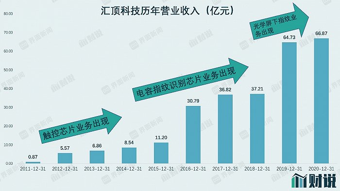 汇顶科技早年以固定电话芯片起家。2007年苹果率先推出电容触摸屏手机,2010年汇顶科技推出触控芯片,随着触控芯片在2012年的放量,公司营收有了第一次跃升。2011年AuthenTec公司研发出全球首款指纹识别芯片,该公司随后于2012年被苹果收购,2014年汇顶科技推出指纹识别芯片,2016年放量带动公司营收实现第二次跃升。2017年,Synaptics推出全球首款光学屏下指纹识别芯片,汇顶科技快速跟进,2018年也推出了光学屏下指纹识别芯片,2019年客户大规模使用后,公司营收迎来第三次跃升。