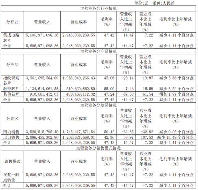 分产品来看,汇顶科技指纹识别芯片营收为35.62亿元,同比下降28.14%,毛利率为45.06%,减少5.66个百分点;触控芯片收入11.35亿元,同比增长7.46%,毛利率为55%,减少3.52个百分点。
