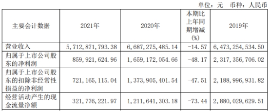 2021年,汇顶科技实现营业收入57.13亿元,同比下降14.57%;归属于上市公司股东的净利润为8.60亿元,同比下降48.17%;归属于上市公司股东的扣除非经常性损益的净利润为7.21亿元,同比下降47.51%;经营活动产生的现金流量净额为3.22亿元,同比下降73.44%。