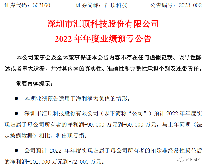 近期,深圳市汇顶科技股份有限公司(简称:汇顶科技)发布2022年年度业绩预亏公告:预计2022年年度实现归属于母公司所有者的净利润-90,000万元到-60,000万元,与上年同期(法定披露数据)相比,将出现亏损;预计2022年年度实现归属于母公司所有者的扣除非经常性损益后的净利润-102,000万元到-72,000万元。