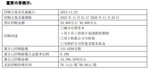自本次回购实施起始日至2026年1月31日,公司股份回购专用证券账户通过集中竞价交易方式已回购公司股份数量为1,330,200股,已回购股份占公司总股本的比例为0.29%,购买的最高价为80.08元/股,最低价为76.11元/股,已支付的总金额为10,389.2939万元(含交易费用)。上述回购进展符合法律法规的规定和公司回购股份方案的要求。
