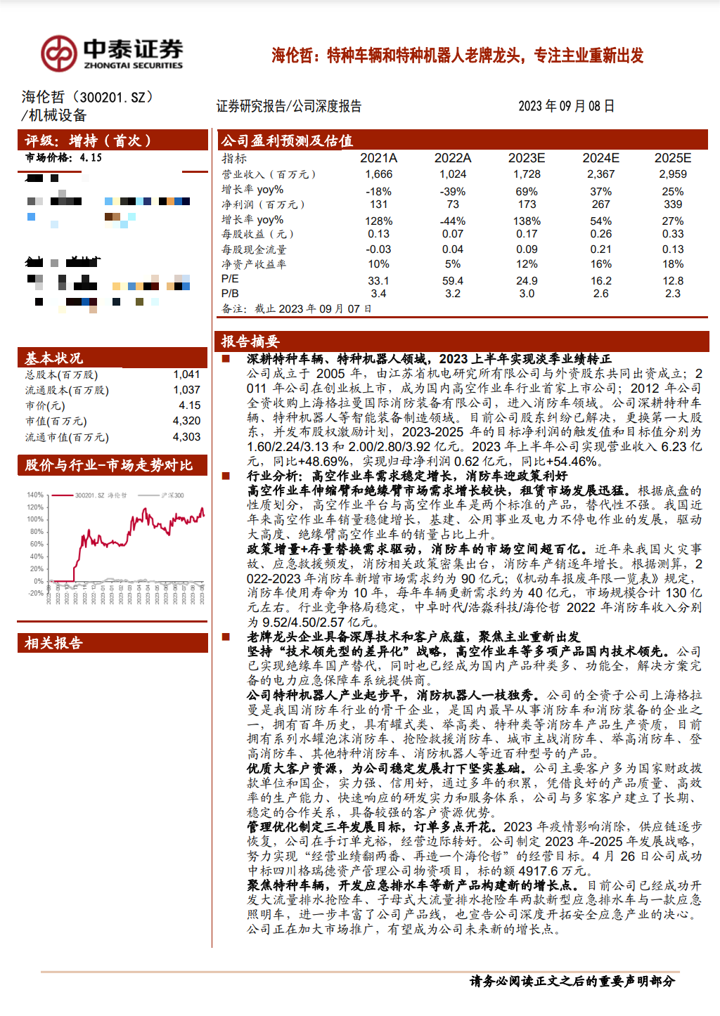(3)公司正在布局应急产业,包括上半年已经推出两款应急排水车、一款应急照明车;国家重视、支持安全应急产业发展,未来公司将整合消防应急、电力应急以及核应急救援等产品,应急产业有望成为公司未来利润增长点;