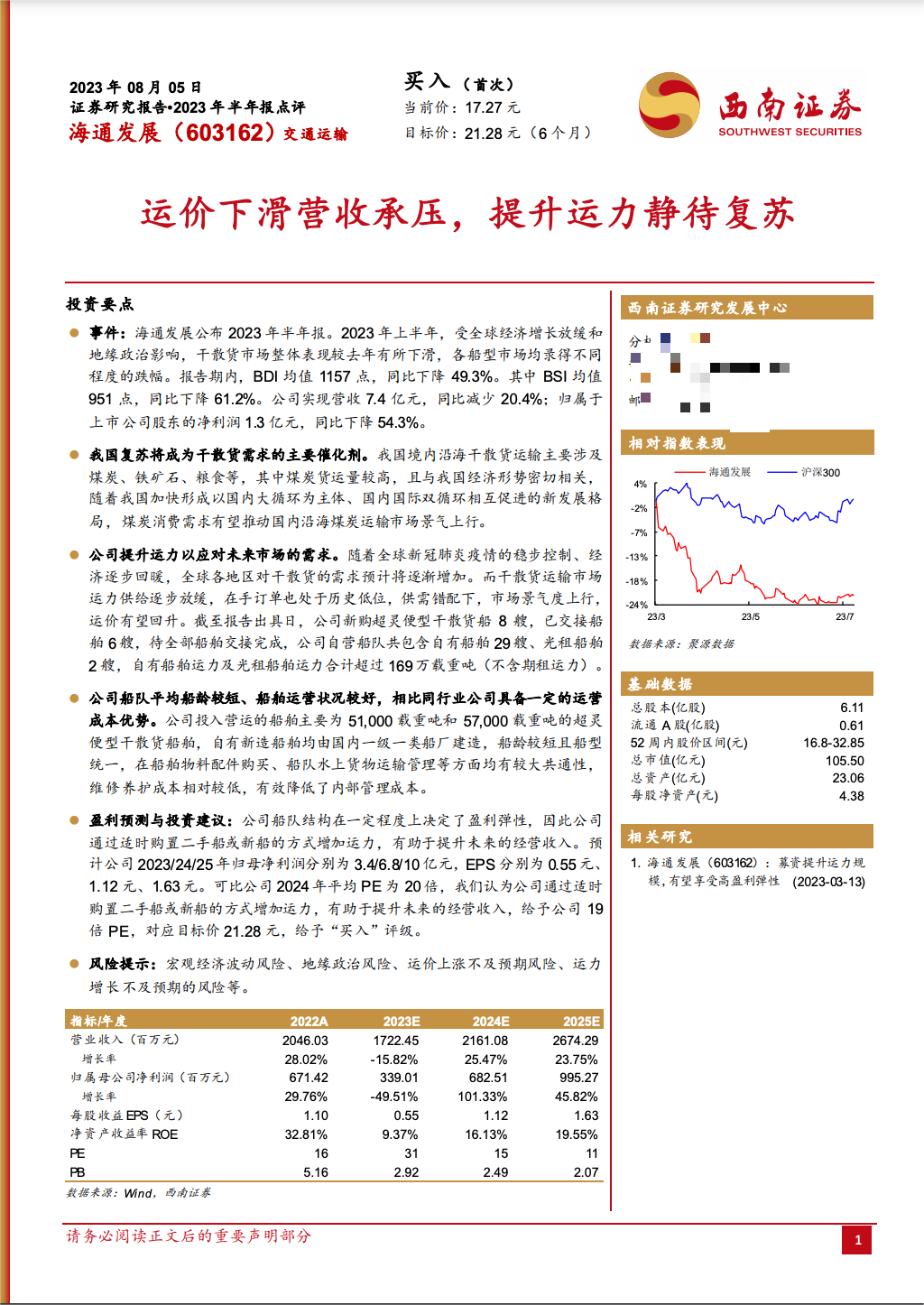 答:海通的船队规模在国内民营企业中存在一定的影响力,但对于国际市场而言规模偏小。因此,公司将利用行业机会,整合管理优势、品牌优势及优质客户资源,做大干散货运输主业,做强外租船业务,实现公司从“依靠重资产投入实现发展”向“以自有规模化运力为基石,高效配置市场化运力,构建强大服务网络”的战略升级,并在资本巿场的助力下,将干散货运输业务、干散货外租船业务结合,构筑领先的综合航运服务能力,未来往轻资产方向转型。短期内,公司资金将优先购买外贸船,内贸船队也将同步发展,从以煤炭业务为主积极拓展到非煤业务,持续内外贸兼营的业务模式。