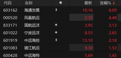 7月29日午后,航运板块持续拉升。14时21分,海通发展涨超8%,凤凰航运、国航远洋等涨幅居前。