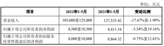 2022年1-9月,公司营业收入预计为105,000万元至125,000万元,同比变动-17.67%至-1.99%;归属于母公司股东的净利润预计为8,500万元至10,500万元,同比变动-3.54%至19.16%;扣除非经常性损益后归属于母公司股东的净利润预计为8,000万元至10,000万元,同比变动-9.75%至12.81%。