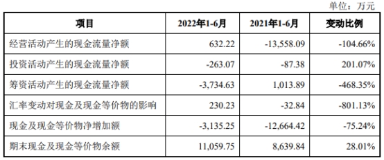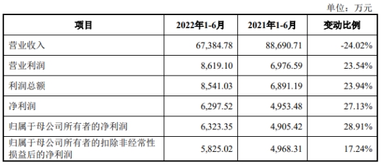 2022年1-6月,公司实现营业收入67,384.78万元,同比下降24.02%;实现净利润6,297.52万元,同比增长27.13%;经营活动产生的现金流量净额为632.22万元,上年同期为-13,558.09万元。