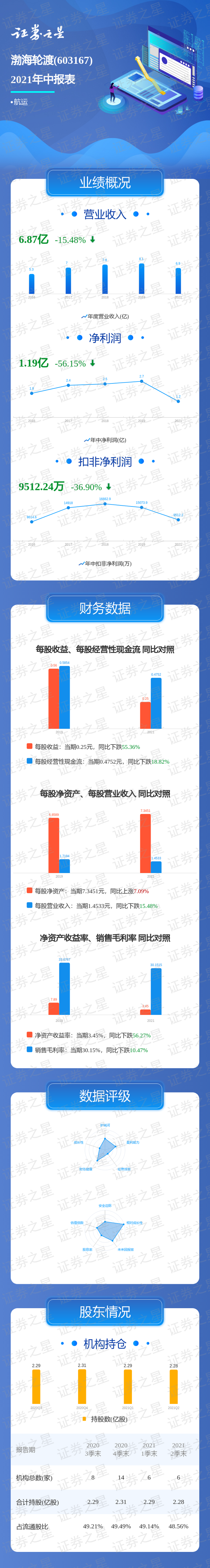 证券之星数据中心讯,渤海轮渡2021中报显示,公司主营收入6.87亿元,同比上升37.84%;归母净利润1.19亿元,同比上升9441.5%;扣非净利润9512.24万元,同比上升371.88%;负债率28.3%,投资收益2683.7万元,财务费用-780.95万元,毛利率30.15%。
