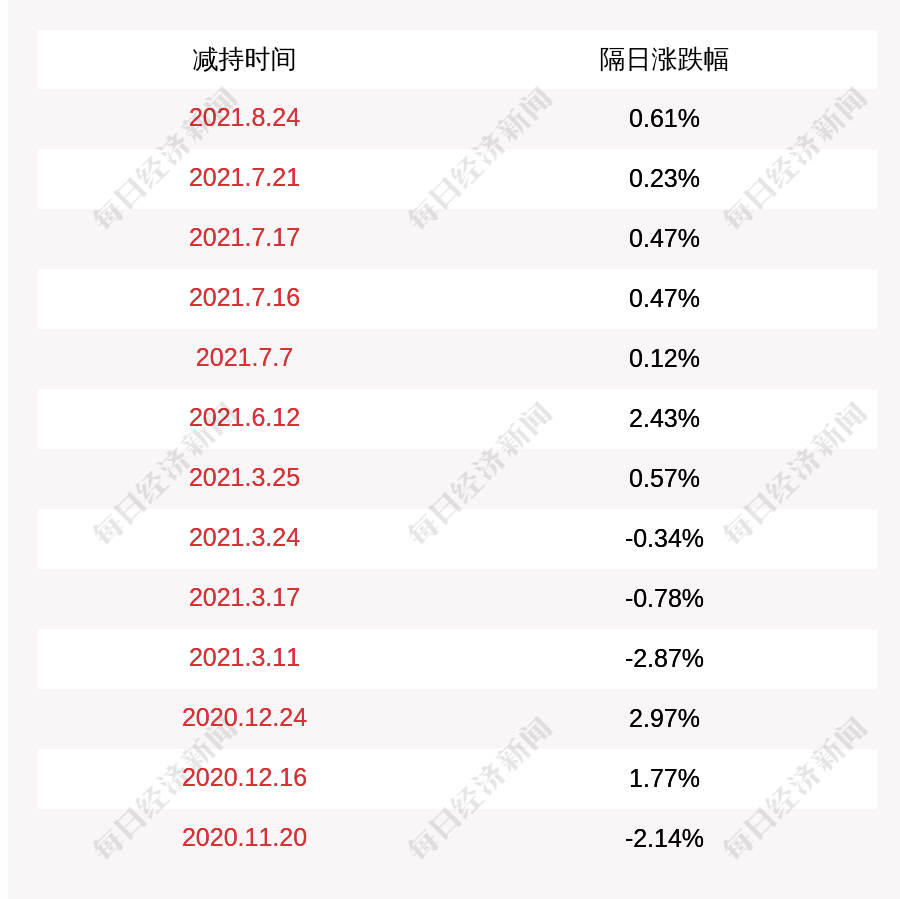 3.渤海轮渡上次发布减持公告是2021年08月24日,第二个交易日上涨0.61%,渤海轮渡近一年共发布14次减持类公告。