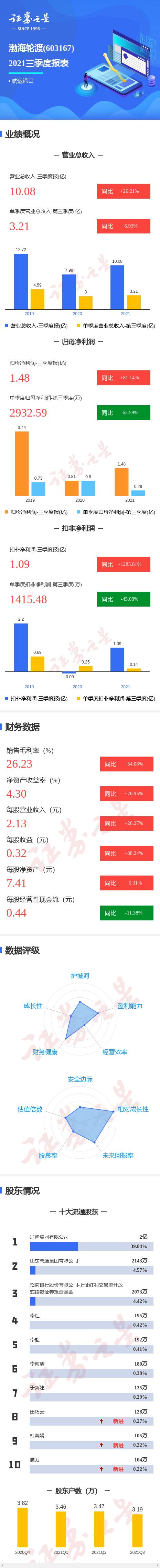渤海轮渡2021三季报显示,公司主营收入10.09亿元,同比上升26.21%;归母净利润1.48亿元,同比上升81.14%;扣非净利润1.09亿元,同比上升1285.81%;其中2021年第三季度,公司单季度主营收入3.21亿元,同比上升6.93%;单季度归母净利润2932.6万元,同比下降63.59%;单季度扣非净利润1415.49万元,同比下降45.08%;负债率26.27%,投资收益2711.92万元,财务费用-1567.24万元,毛利率26.23%。