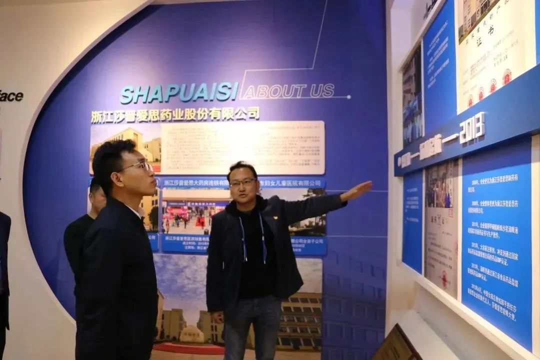 在党群服务中心的莎药印记展示厅,时总向程局长一行作莎普爱思历史沿革、经营发展、产品系列、党工建设、社会贡献等内容讲解,并带领程局长一行来到党员活动室、健身吧、谈心室等功能区进行参观。