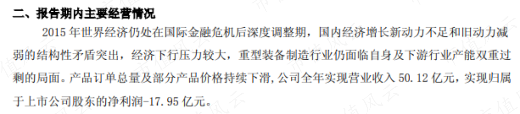中国一重(601106.SH)在2015年年报中提到:重型装备制造行业仍面临自身及下游行业产能双重过剩的局面。