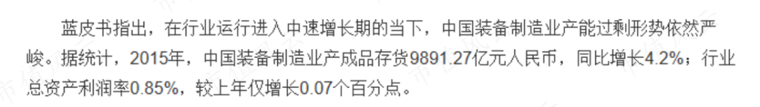 《装备制造业蓝皮书:中国装备制造业发展报告(2016)》一书也指出,当时装备制造业下行压力依然较大,产能过剩问题亟待解决。2015年,中国装备制造业产成品存货9,891.3亿元人民币,同比增长4.2%。