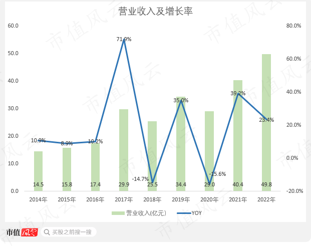 根据新鲜出炉的2022年年报,公司2022年营收49.8亿,同比上升23.4%;净利润1.8亿,同比上升37.6%。