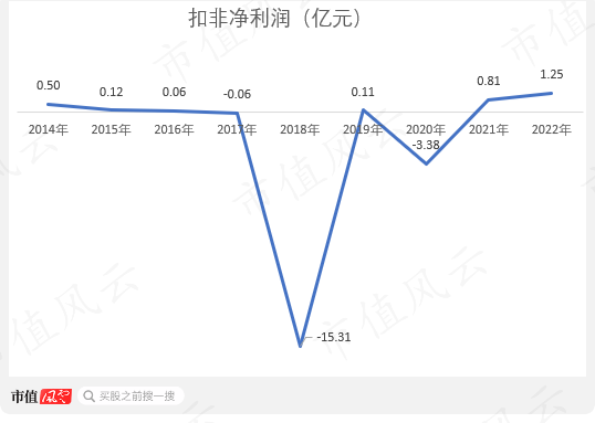 2014年,扣非净利润为0.5亿,同比上升8.7%;2015年则为0.1亿,同比下降76%。
