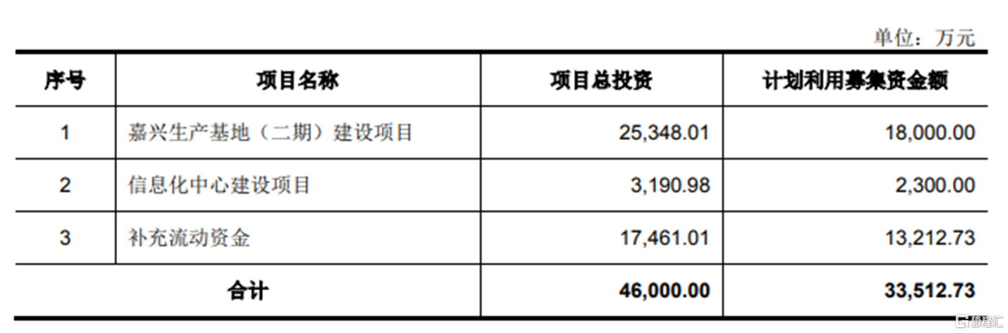 本次IPO拟募资3.35亿元,主要用于嘉兴生产基地(二期)建设项目、信息化中心建设项目