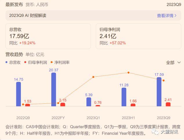 据第三季度财务报告显示,2023年第三季度,宝立食品实现营业收入17.59亿元,同比增长19.24%;实现归属于上市公司股东的扣除非经常性损益后净利润2.41亿元,同比增长57.02%。