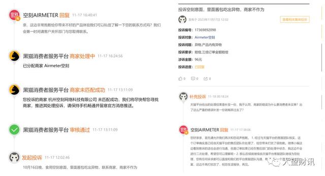最新的投诉为今年11月17日,至今状态为已回复,投诉问题为“10月16日晚,食用空刻意面,里面酱包吃出异物,联系商家,商家不作为”,11月17日,空刻Airmeter回复:“亲,这边非常抱歉给你带来不好的产品体验我们可以私信了解一下您的联系方式吗?我们会第一时间请客户关怀部门与您取得联系。”