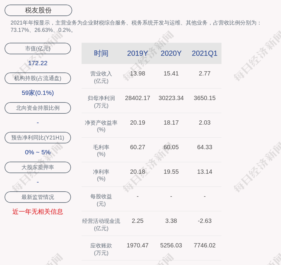 2021年年报显示,税友股份的主营业务为企业财税综合服务、税务系统开发与运维、其他业务,占营收比例分别为:73.17%、26.63%、0.2%。
