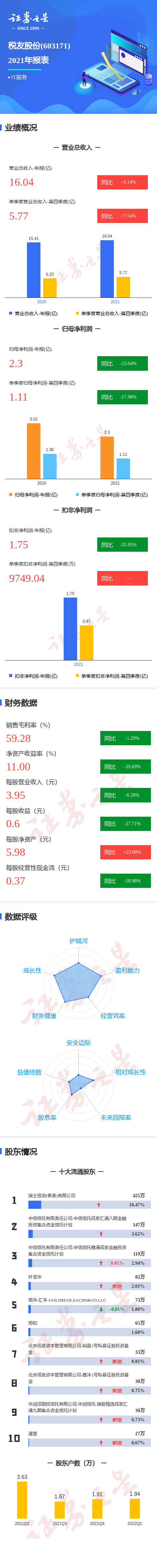 税友股份2021年报显示,公司主营收入16.05亿元,同比上升4.14%;归母净利润2.31亿元,同比下降23.64%;扣非净利润1.75亿元,同比下降35.95%;其中2021年第四季度,公司单季度主营收入5.78亿元,同比上升7.54%;单季度归母净利润1.12亿元,同比下降17.98%;单季度扣非净利润9749.04万元,负债率30.6%,投资收益2142.16万元,财务费用-4816.28万元,毛利率59.28%。