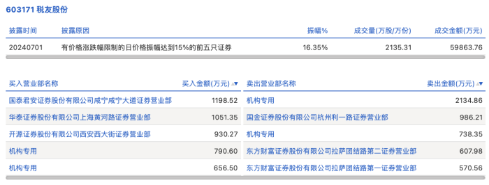 7月1日,税友股份今日涨停,龙虎榜数据显示,上榜营业部席位全天成交9665.19万元,占当日总成交金额比例为16.15%。其中,买入金额为4627.23万元,卖出金额为5037.95万元,合计净卖出410.72万元。