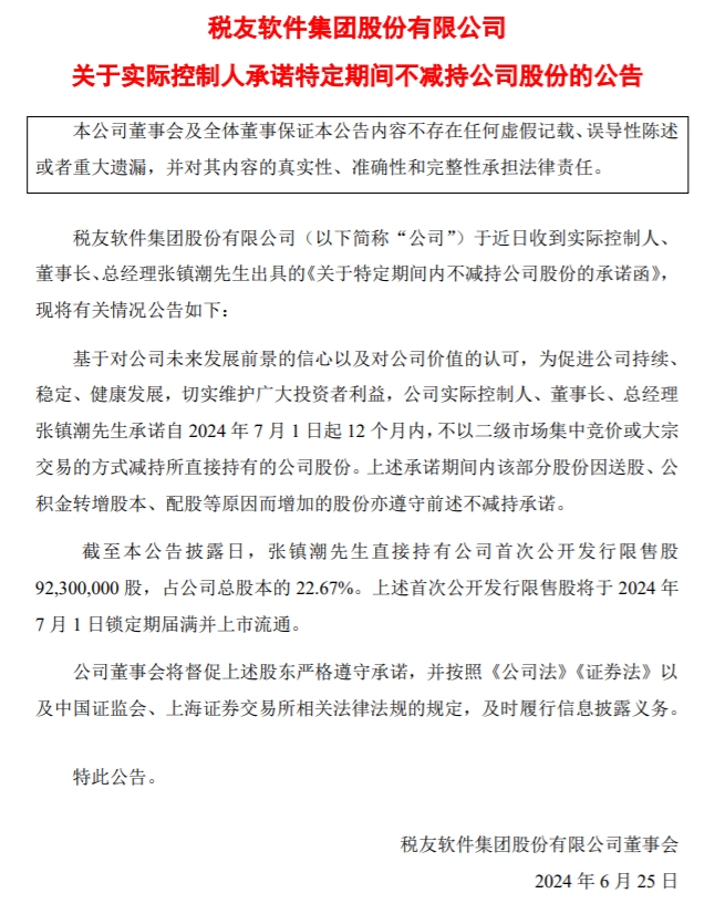 由于卖出意愿较强,容易引发抛售,进而影响股价。6月25日,税友股份董事长、总经理张镇潮出具《关于特定期间内不减持公司股份的承诺函》。