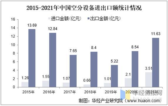 华经产业研究院数据显示,近几年来,我国空分设备的均出口额大于进口额,2021年中国空分设备实现进口金额3.51亿元,同比增长67.14%;实现出口金额11.63亿元,同比增长36.2%。