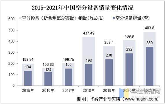 2015年以来,我国空分设备的销量整体上呈增长态势,2021年中国空分设备(折合制氧总容量)销量达483.8万m3/h,空分设备销量达350套。