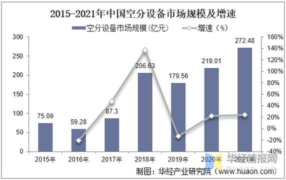 从上世纪80年代开始,深冷技术行业随着我国工业气体行业及下游应用领域的发展而呈现快速发展,行业整体市场化程度较高,其中空分设备已处于成熟的发展阶段。华经产业研究院数据显示,近年来我国空分设备市快速增长,2021年市场规模达272.48亿元,同比增长24.4%。