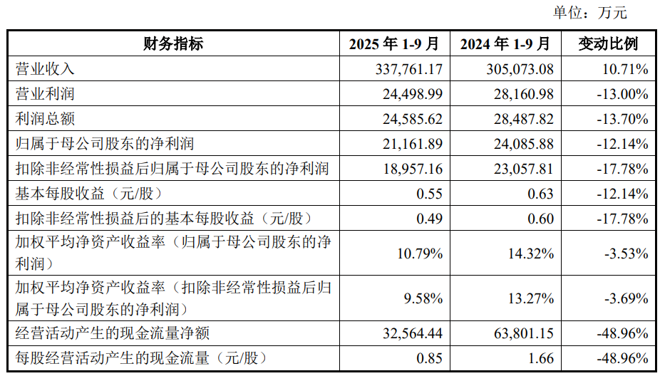 2025年前三季度,超颖电子的营业收入为337,761.17万元,同比增长10.71%;归属于母公司股东的净利润21,161.89万元,同比下降12.14%;扣除非经常性损益后归属于母公司股东的净利润18,957.16万元,同比下降17.78%;经营活动产生的现金流量净额32,564.44万元,同比下降48.96%。