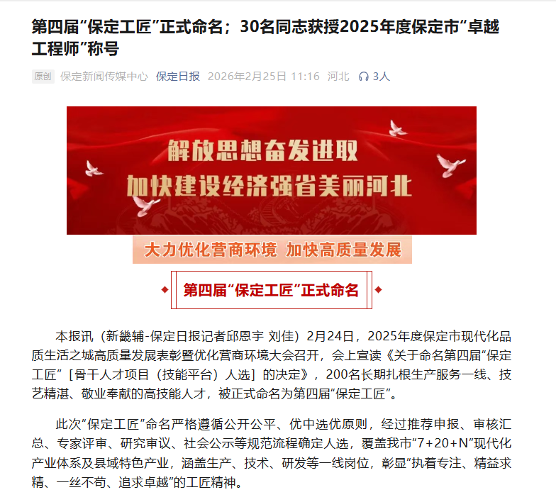 2月24日,保定市现代化品质生活之城高质量发展表彰暨优化营商环境大会隆重召开。大会对2025年度高质量发展先进集体和个人、第四届“保定工匠”等进行表彰,汇通集团员工孙正仓、亢肖凭借精湛技艺与突出贡献,成功入选第四届“保定工匠”名单,用匠心为企业高质量发展添彩,为公司赢得荣誉。