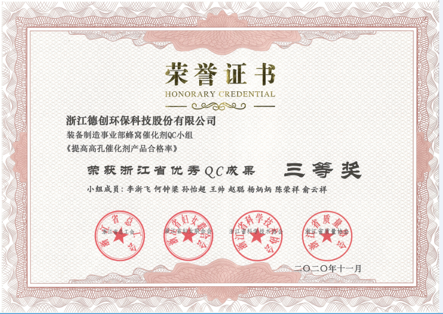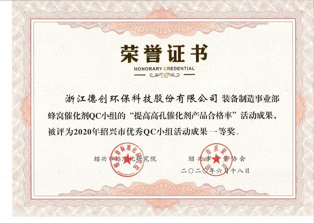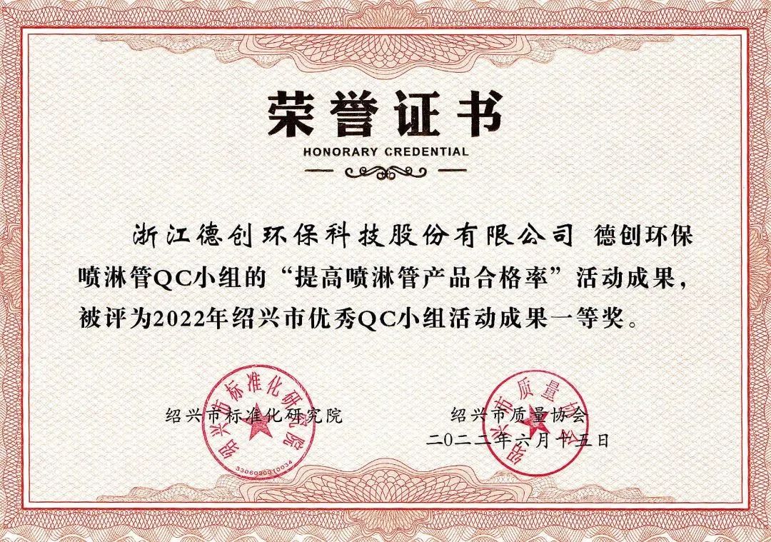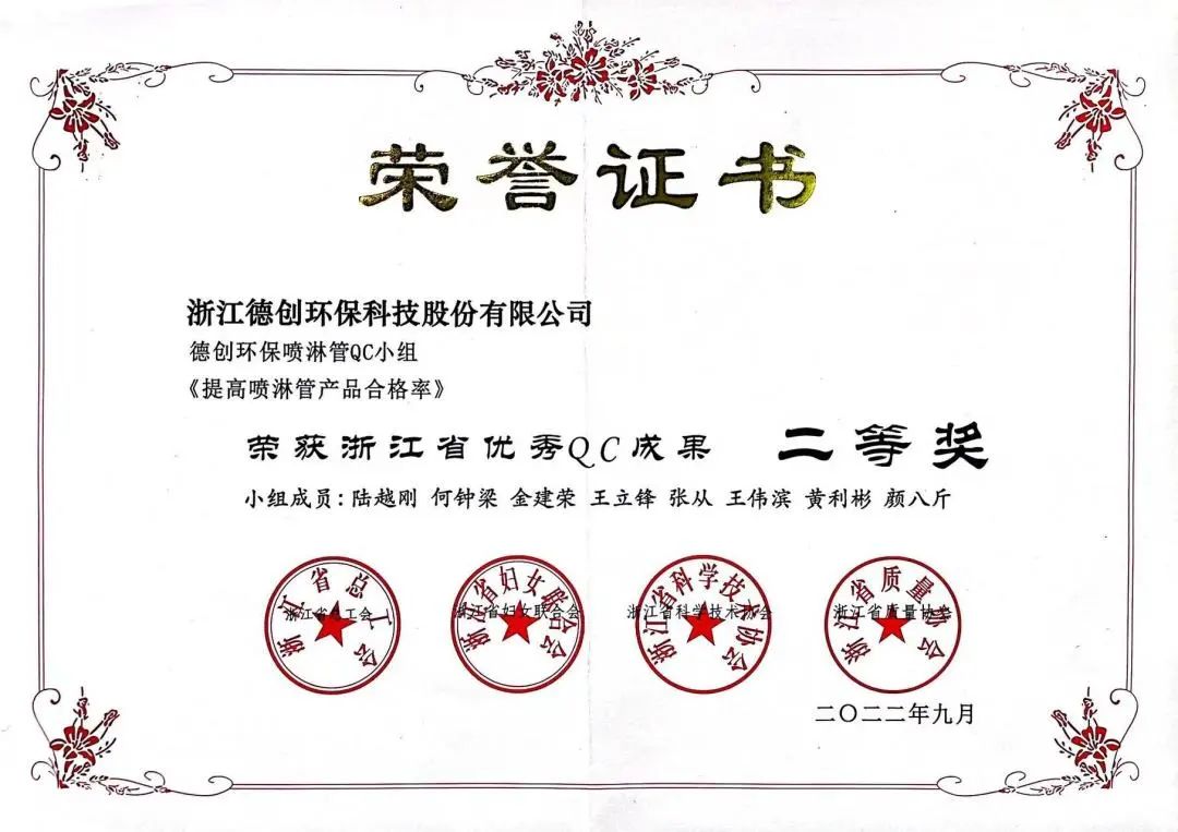 德创环保长期坚持践行质量创新发展理念,严格落实质量创新工作部署,高度重视生产中存在的技术难题和质量管理工作,依托搭建的QC小组活动平台,扎实推进质量创新课题的创建工作。近年来连续多次获得省、市优秀QC成果荣誉,其中2022年“提高喷淋管产品合格率项目”获得浙江省优秀QC成果二等奖、2021年“提高田字格产品合格率项目”获得绍兴市优秀QC成果二等奖、2020年“提高高孔催化剂产品合格率项目”获得绍兴市优秀QC成果一等奖。这一系列的优秀QC成果,推动着企业提质增效、赋能发展。