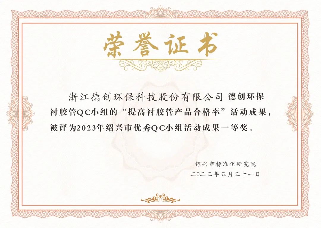 近日,绍兴市标准化研究院公布2023年绍兴市优秀QC小组活动成果名单,其中德创环保衬胶管QC 小组成果“提高衬胶管产品合格率”,荣获绍兴市优秀QC小组活动成果一等奖!