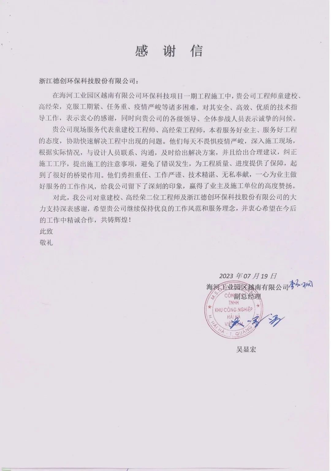 德创环保珍视每一封客户发来的感谢信,并始终诚心诚意服务每一位客户,用诚信的理念追求双赢。德创环保将继续保持优良的工作风范和服务理念,与客户共铸辉煌!