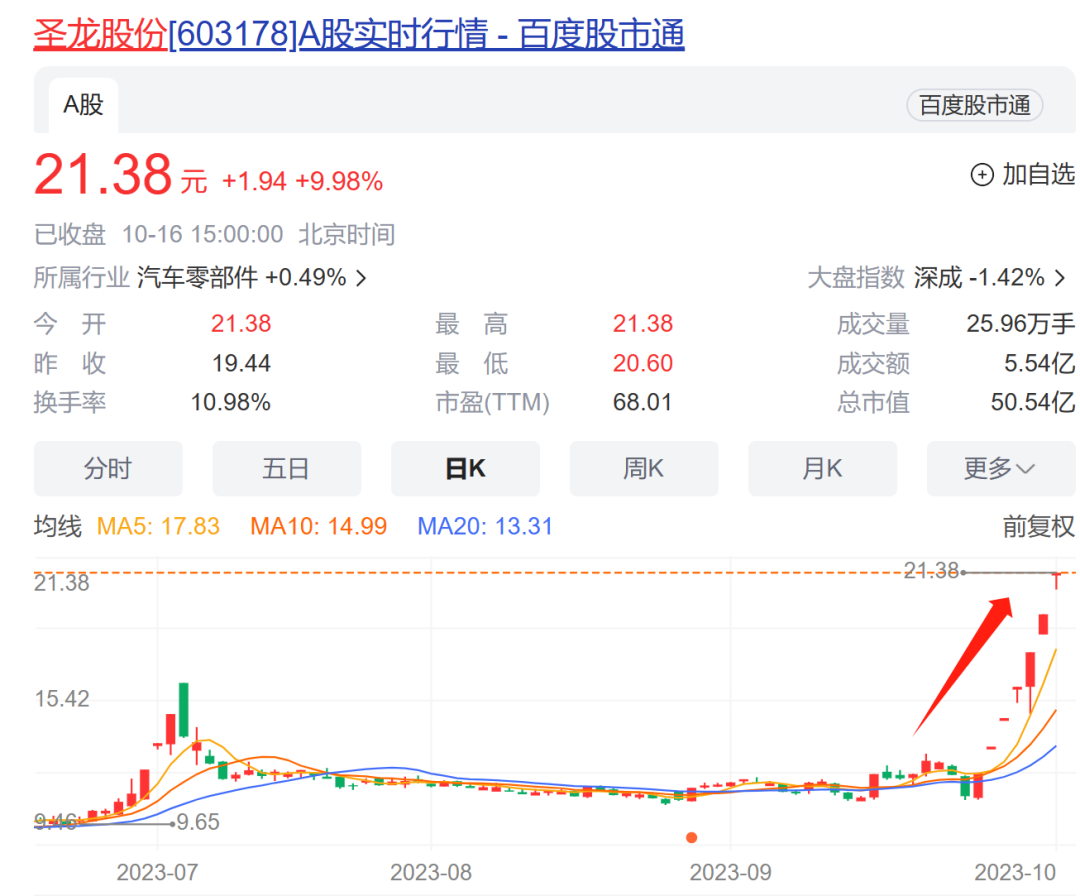 在诸多“龙”股中,圣龙股份最为引人关注。公司股票自9月27日至10月16日8个交易日中,7个交易日收盘价格涨停,自9月27日以来,圣龙股份收盘价累计上涨幅度为78.91%,同期申万汽车零部件行业平均涨幅为4.41%,公司股票短期涨幅严重高于同期行业涨幅及上证指数,存在市场情绪过热的情形。