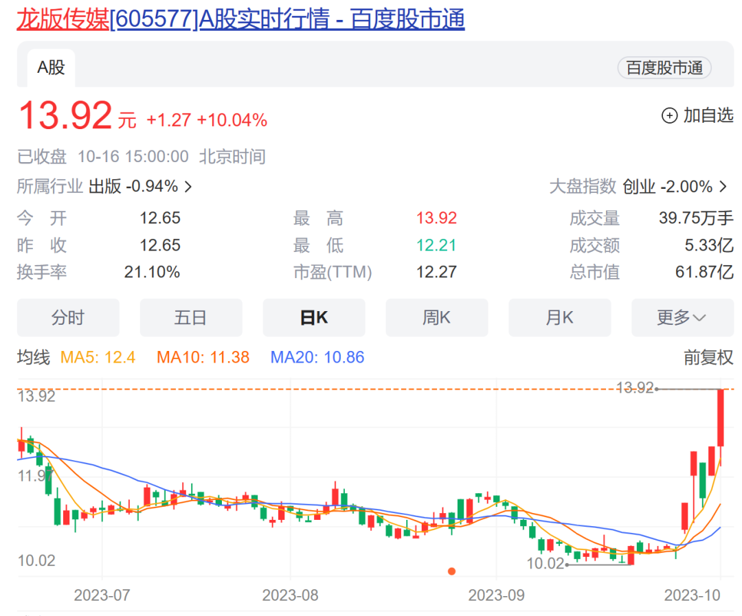 龙版传媒收获5天4板。此前在10月12日晚间,龙版传媒披露业绩预增公告,预计2023年前三季度实现归属于母公司所有者的净利润3.57亿元左右,与上年同期相比,将增加7432.56万元左右,同比增长26.26%左右。预计扣除非经常性损益的净利润3.46亿元,与上年同期相比,将增加9018.11万元左右,同比增长35.27%左右。