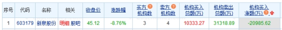 龙虎榜数据显示,买入新泉股份金额最大的前5名中,3家为机构专用席位。卖出新泉股份金额最大的前5名中,4家为机构专用席位。经统计,机构席位今日卖出新泉股份净额为20985.62万元。