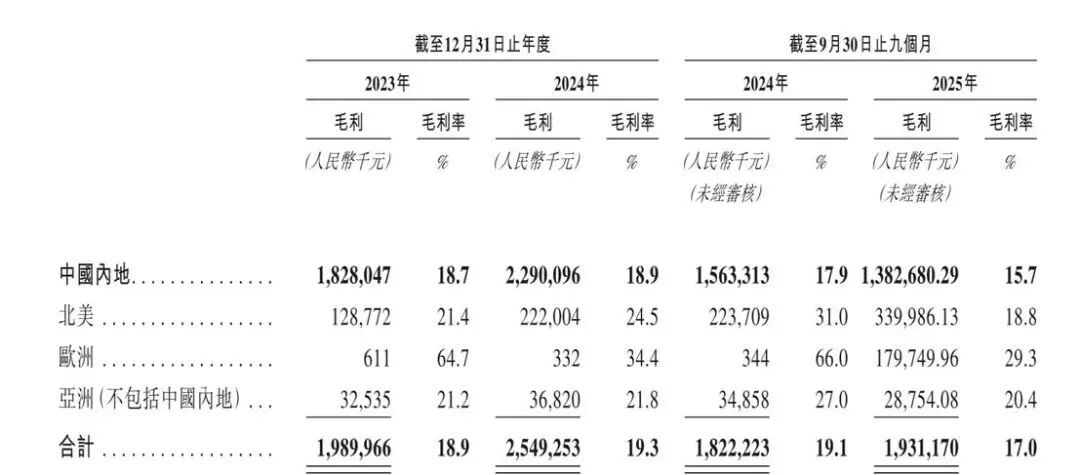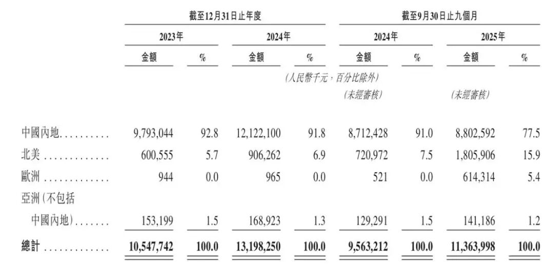 2025年前9个月,公司来自北美市场的收入达到了18.06亿元,占比总收入的15.9%,而2023年及2024年,公司来自北美市场的收入分别为6.01亿元及9.06亿元,占比总收入的5.7%及6.9%。