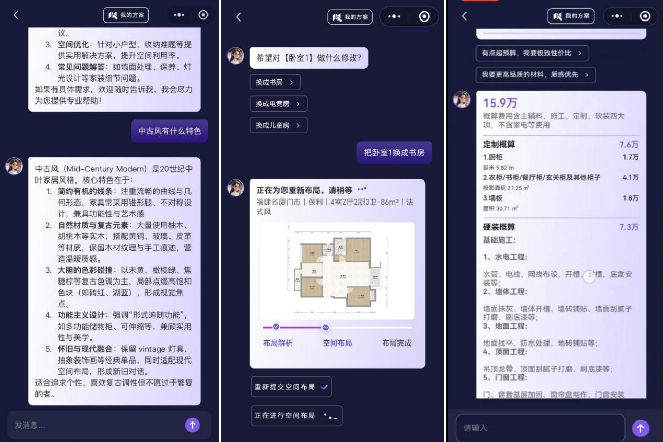 想象一下,你直接拍照上传毛坯房/户型图,选择喜爱风格,飞流AI2.1便能提取空间特点、风格要素融入设计方案。同时,还可以文字描述“把卧室换成书房”,智能体也能精准理解,基于人体工程学、科学动线、色彩美学等专业知识,优化方案。不仅如此,它还能同步生成初步的装修预算。